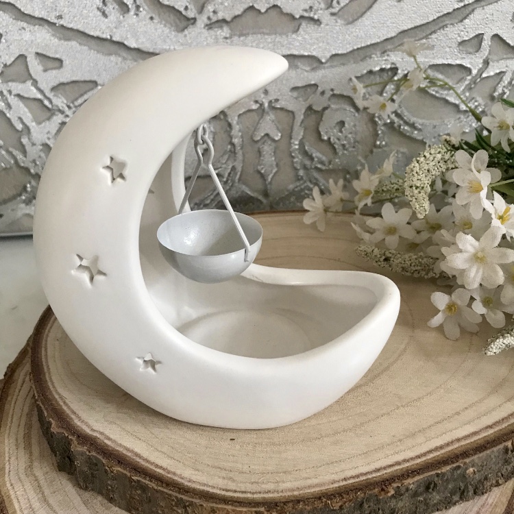 Place an unscented tea light in the base of this white crescent moon oil burner after filling the hanging bowl with a wax melt, and watch as the cut out star details cast a celestial glow.