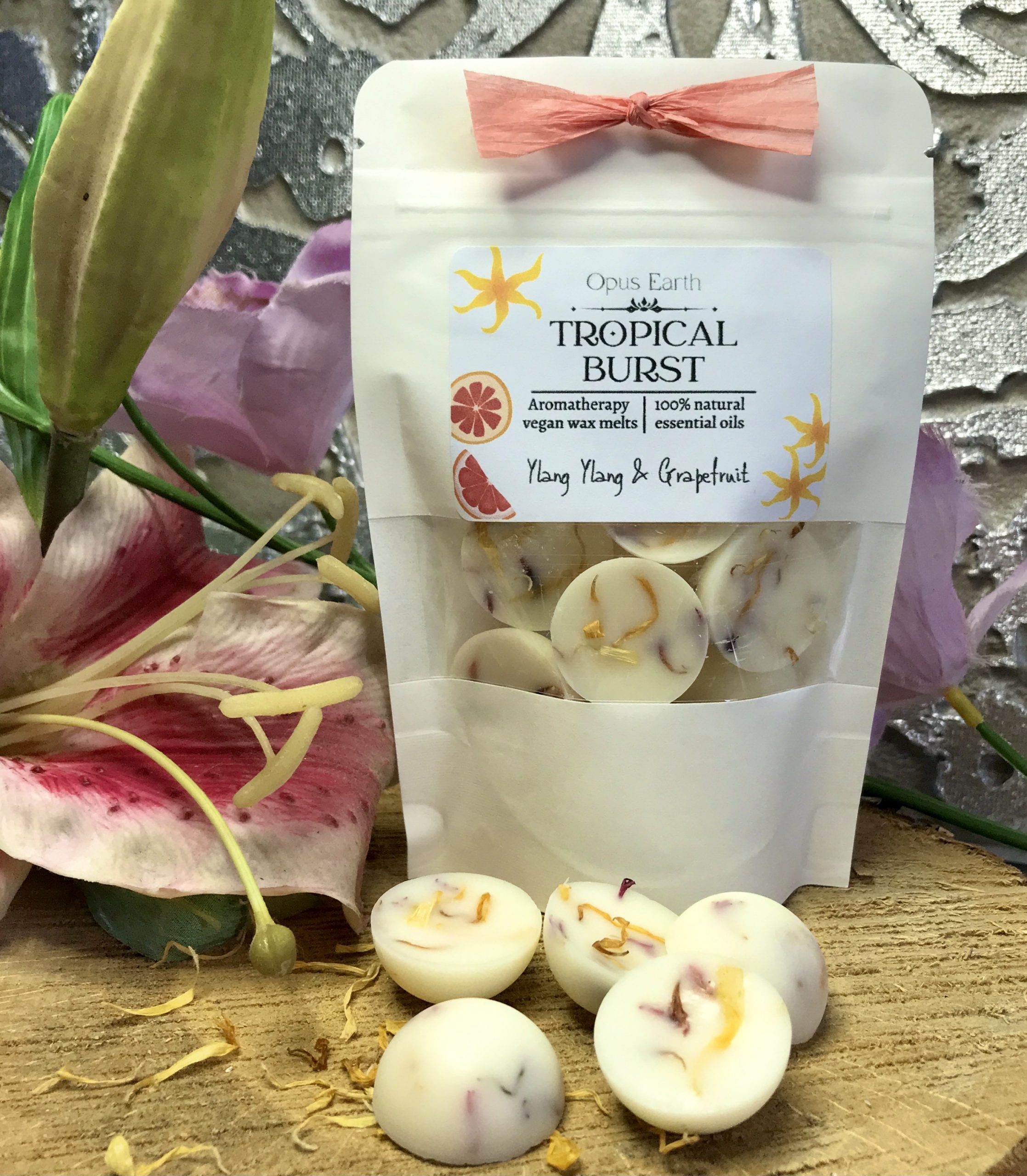 Our Tropical Burst vegan wax melts are made with coconut & rapeseed wax infused with pure essential oils and natural dried botanical elements. They will fill your home or work space with a beautiful natural scent along with promoting aromatherapy benefits too!